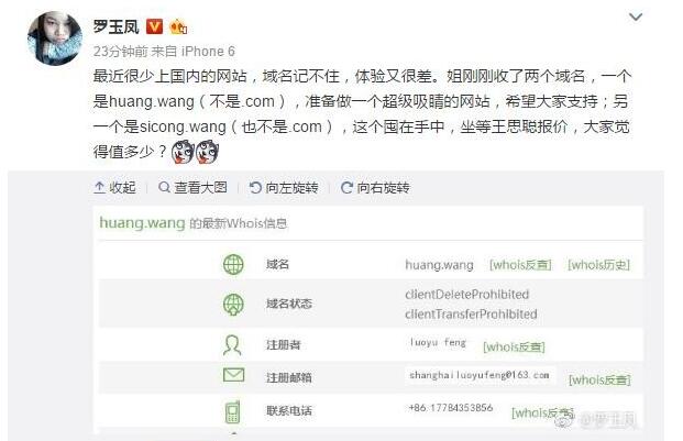 知名搞笑幽默博主@Happy张江发文说:这回跨界有点大!刚刚,罗玉凤在微博宣布,她收购了顶级域名huang.wang和sicong.wang,还准备做网站?看这网址的拼音,脸都忍不住红了……据了解.wang和.com一样都是域名!